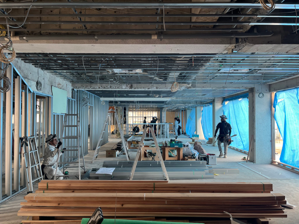 内部は既存の床組や間仕切り壁や天井などはほぼ全て撤去し、現れた無垢な躯体に直接仕上げ塗りを施した。