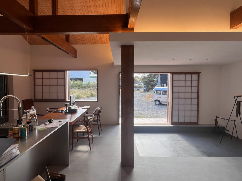 内部は既存の床組や間仕切り壁や天井などはほぼ全て撤去し、現れた無垢な躯体に直接仕上げ塗りを施した。